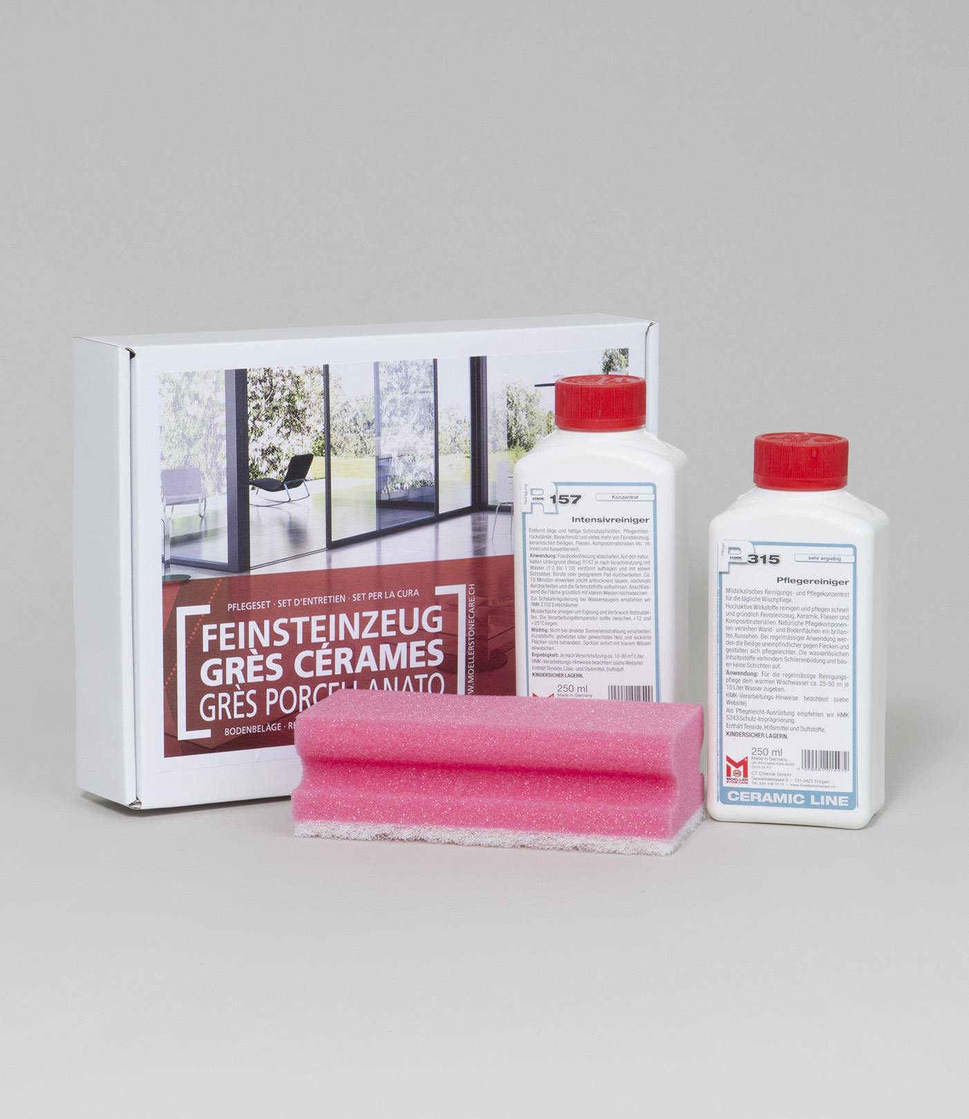 Pflegeset für Feinsteinzeug und Keramik. Enthält abgestimmte Reinigungs- und Pflegeprodukte für Bodenbeläge, Wände usw.